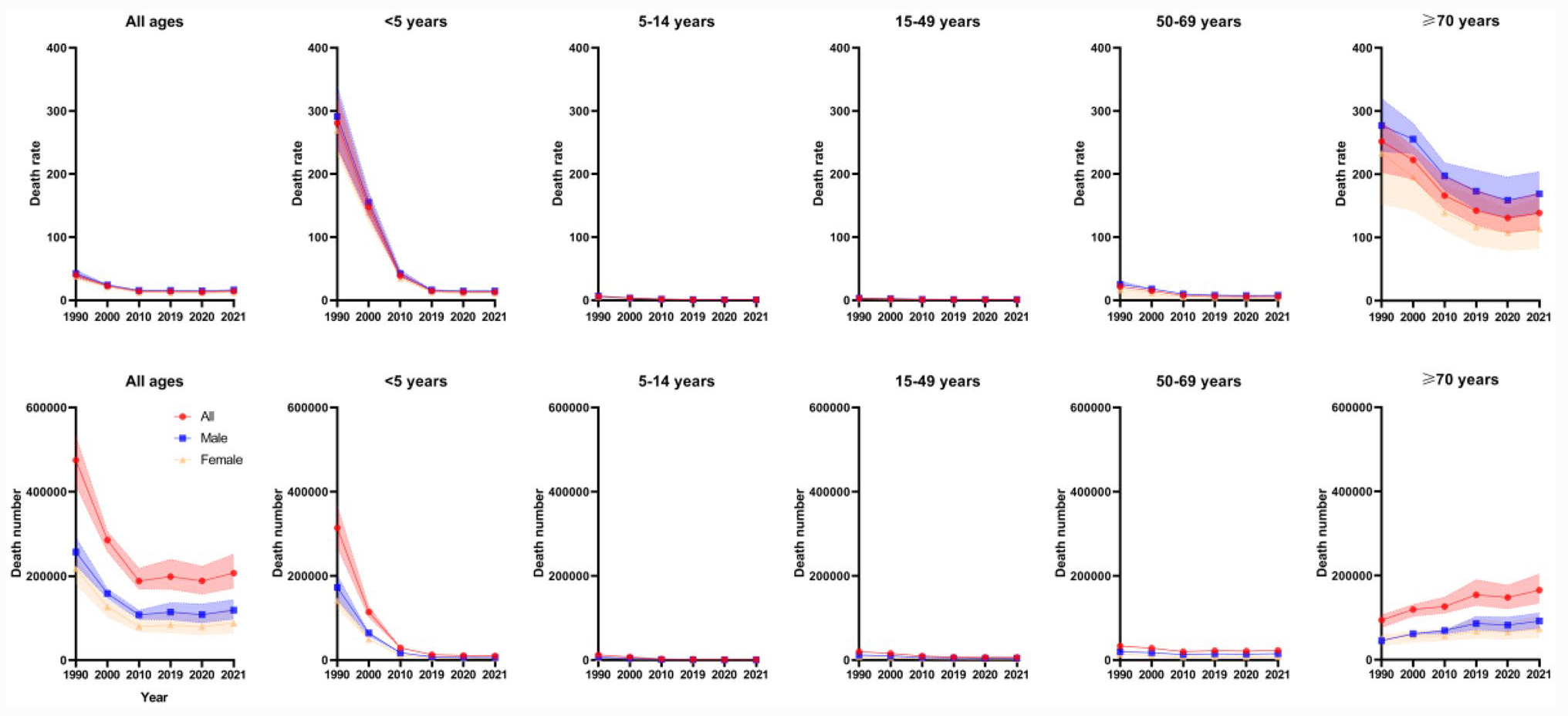 圖3:1990-2021年中國按年齡和性別劃分的LRI死亡率和死亡人數(shù)