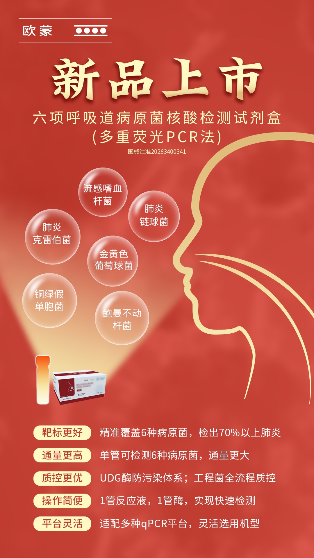 當(dāng)呼吸道感染診療進(jìn)入“精準(zhǔn)化、高效化”時(shí)代,臨床對病原菌檢測的“全、快、準(zhǔn)”需求愈發(fā)迫切。近日,歐蒙六項(xiàng)呼吸道病原菌核酸檢測試劑盒(多重?zé)晒釶CR法)重磅上市,以覆蓋六靶標(biāo)、高精準(zhǔn)檢測、便捷化操作、快速出結(jié)果,為呼吸道感染病原學(xué)診斷注入新動能,守護(hù)每一次呼吸健康!