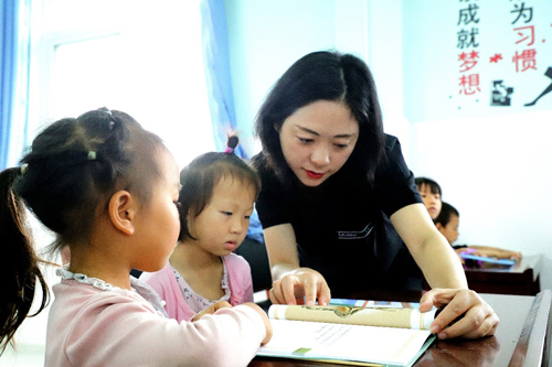 志愿者和孩子們?cè)趷坌膱D書閱讀角