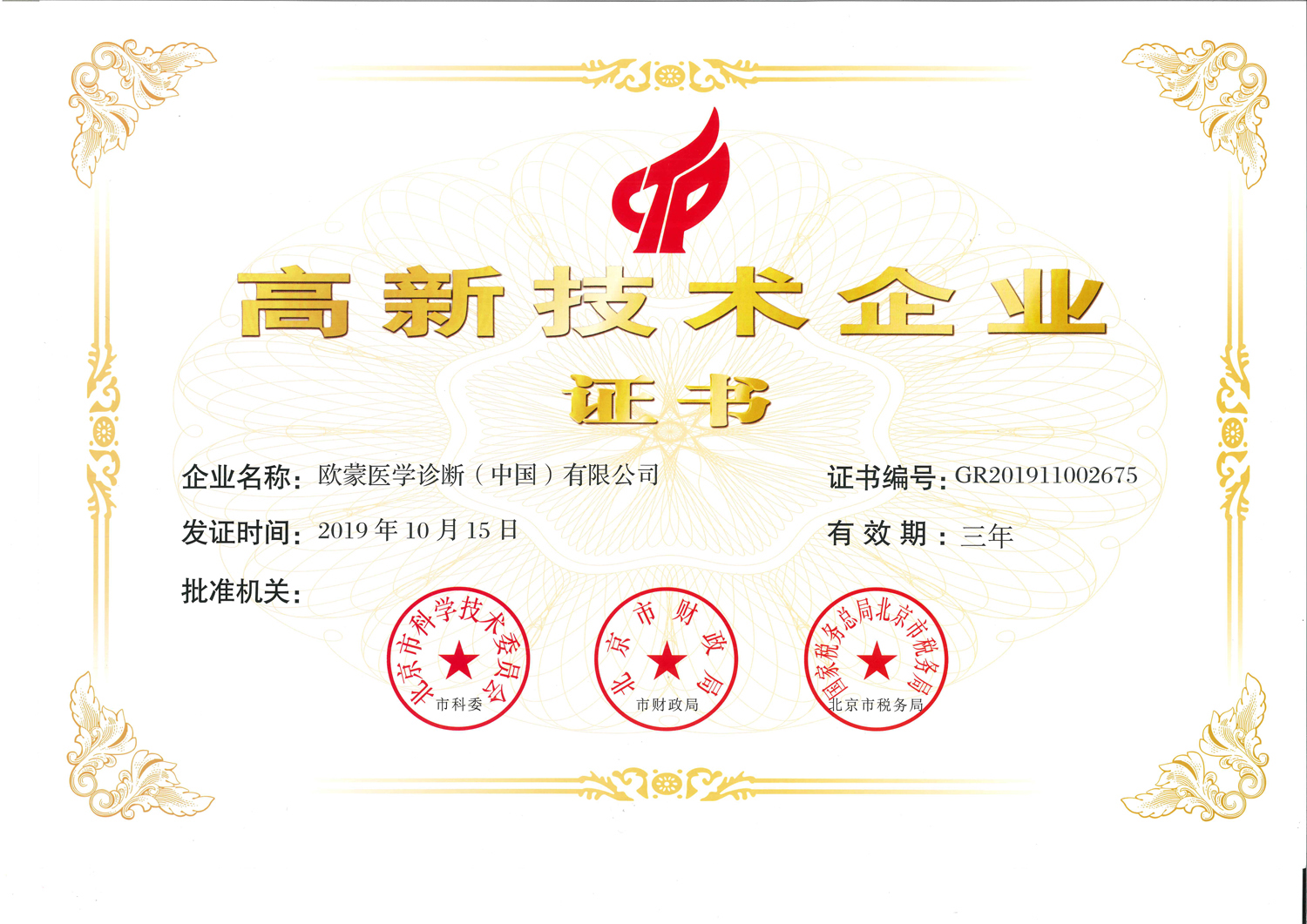 依據(jù)科技部、財政部、國家稅務(wù)總局《高新技術(shù)企業(yè)認(rèn)定管理辦法》、《高新技術(shù)企業(yè)認(rèn)定管理工作指引》等相關(guān)規(guī)定,歐蒙醫(yī)學(xué)自2016年首次獲得國家高新技術(shù)企業(yè)資格認(rèn)定以來,于今年10月通過了國家高新技術(shù)企業(yè)資格復(fù)審。這標(biāo)志著企業(yè)三年來取得的一系列發(fā)展業(yè)績及科研成果、創(chuàng)新卓越完善的科研體系、積極進(jìn)取高素質(zhì)的研發(fā)團隊等再次得到北京市級相關(guān)部門的肯定與認(rèn)可。