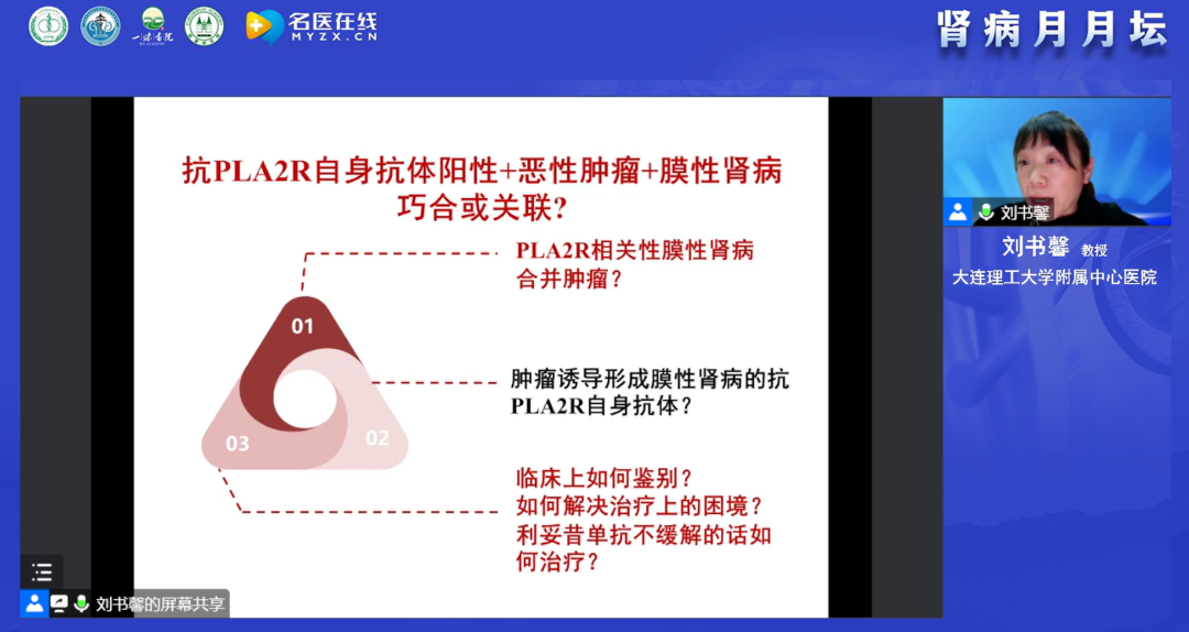 劉書馨教授分享了合并肺癌的膜性腎病病例,通過病例的分析和長期隨訪治療,詳細(xì)闡述了該患者的具體病情。劉教授也提出了疑問抗PLA2R自身抗體陽性、惡性腫瘤及膜性腎病是否是巧合還是存在關(guān)聯(lián)?惡性腫瘤相關(guān)膜性腎病的腎組織和血液循環(huán)中較少檢出PLA2R抗體,但抗PLA2R抗體陽性不能排除腫瘤繼發(fā)的膜性腎病。腫瘤可能會繼發(fā)患者的自身免疫反應(yīng),PLA2R被證明調(diào)節(jié)多種抗腫瘤和抗炎反應(yīng),包括細(xì)胞凋亡、復(fù)制活應(yīng)激誘導(dǎo)的衰老,并且抑制細(xì)胞的轉(zhuǎn)化。關(guān)于腫瘤和膜性腎病之間是因果關(guān)系還是并發(fā)關(guān)系,劉教授也指出了有研究提出的三個確定標(biāo)準(zhǔn):一個是惡性腫瘤經(jīng)治療后膜性腎病是否緩解;其次腎病復(fù)發(fā)與惡性腫瘤復(fù)發(fā)是否同步;第三在免疫沉積物中檢測腫瘤抗原或抗腫瘤抗體。但是臨床實踐中很難應(yīng)用這種標(biāo)準(zhǔn),盡管這些標(biāo)準(zhǔn)為因果關(guān)系提供了有力證據(jù),但缺少這些結(jié)果也并不能完全否認(rèn)腫瘤的存在。劉教授最后指出,膜性腎病與腫瘤之間的關(guān)系還需要進(jìn)一步的研究,因此未來需要大量的臨床病例以及更多的研究來尋找特異性抗原在血清學(xué)、腎組織中的表達(dá)、臨床意義,以及與惡性腫瘤之間的任何潛在聯(lián)系來輔助臨床決策,避免漏診誤診而導(dǎo)致的膜性腎病不緩解或腫瘤惡化。這對于腫瘤相關(guān)性膜性腎病患者的診斷和治療具有重要意義。