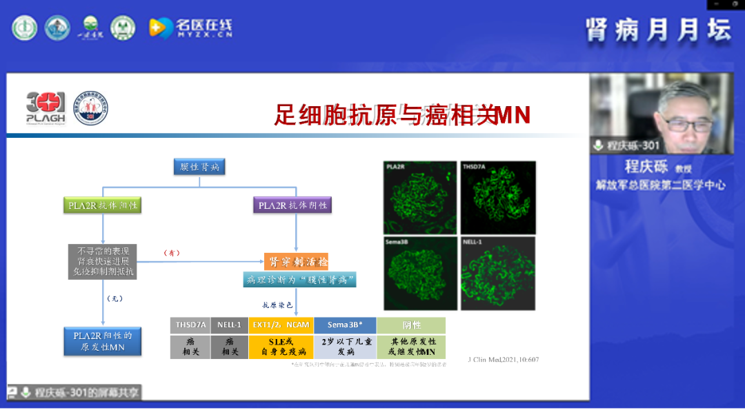程教授提出腫瘤相關(guān)的膜性腎病也可以定義為副腫瘤性腎小球腎炎,在副腫瘤性的腎小球腎炎當(dāng)中,膜性腎病應(yīng)該排在第一位。關(guān)于副腫瘤性的腎小球腎炎,文獻(xiàn)上定義是①治療腫瘤的過程中,腫瘤緩解,腎臟病緩解;②腫瘤復(fù)發(fā),腎臟病也復(fù)發(fā);③也是做最重要和難度最大的,就是需要進(jìn)一步探究腫瘤與MN之間內(nèi)在的病理生理機(jī)制。程教授的團(tuán)隊在1000多例膜性腎病的隨訪隊列中,發(fā)現(xiàn)了16例患者合并實體腫瘤,這其中PLA2R抗原陽性10例,NELL-1抗原陽性1例,另外5例尚未發(fā)現(xiàn)其他靶抗原,她們在TSHD7A抗原陽性的MN患者中沒有發(fā)現(xiàn)有合并腫瘤,這個結(jié)果可能和西方報道有一些差異。在中國人群當(dāng)中發(fā)現(xiàn)NELL-1靶抗原陽性的比例超過TSHD7A抗原陽性,她們在PLA2R抗原陰性的患者中發(fā)現(xiàn)有35%患者NELL-1抗原是陽性,而且有一例PLA2R及NELL-1雙抗原陽性患者合并腫瘤,對于中國人群來說要進(jìn)一步關(guān)注NELL-1抗原陽性的MN患者臨床病理特點(diǎn)及是否合并有腫瘤的高發(fā)。最后程教授談及膜性腎病合并腫瘤,可能還會牽涉到醫(yī)療安全的問題,膜性腎病高發(fā)人群都是中老年人群,患者有可能在激素免疫抑制劑治療過程當(dāng)中發(fā)現(xiàn)了腫瘤,因此會被誤認(rèn)為是治療所導(dǎo)致的腫瘤發(fā)生,確需對MN患者進(jìn)行腫瘤的嚴(yán)密追蹤和篩查,現(xiàn)今醫(yī)療安全需放在首位考慮。最后程教授希望盡可能去尋找MN的致病靶抗原,不同的靶抗原可能會有不同的病理、臨床特點(diǎn)。