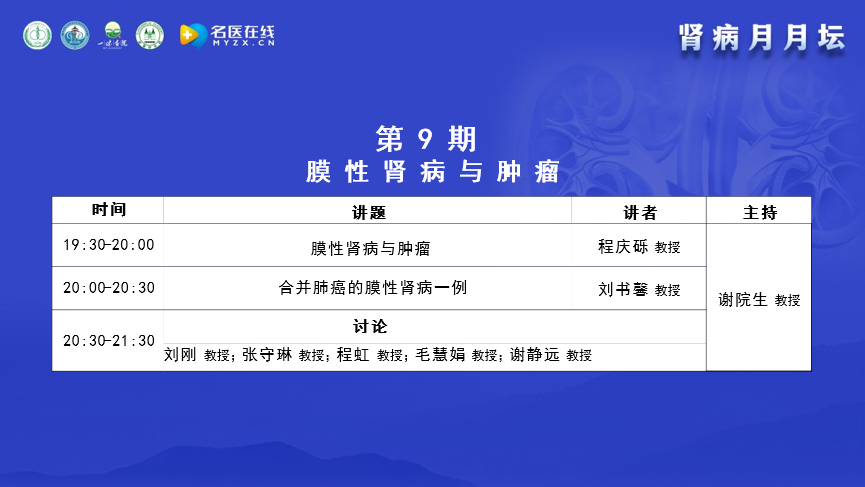 眾所周知,腎臟病患病率很高,特別是膜性腎病,在很多單位的腎活檢比率中占據(jù)第一;膜性腎病的無創(chuàng)診斷和治療手段日新月異;而且膜性腎病的異質(zhì)性很大,很多膜性腎病的病理表現(xiàn)大同小異,但是致病原因卻不一致,診療手段應(yīng)對應(yīng)病因。基于此背景,“腎病月月壇”自2022年5月17日開始舉辦,在每個月的第三周的周二晚上,每月一期,每期一個主題,已經(jīng)舉辦了八期,包括“激素和免疫抑制劑在膜性腎病的合理應(yīng)用”、“利妥昔單抗在膜性腎病的合理應(yīng)用”、“原發(fā)性和繼發(fā)性膜性腎病的鑒別”、“中醫(yī)對膜性腎病的認(rèn)識”、“膜性腎病的抗原分類及發(fā)病機(jī)制”、“膜性腎病的臨床表現(xiàn)、無創(chuàng)診斷和病理診斷”、“膜性腎病的自發(fā)緩解和非免疫抑制治療”、“非典型膜性腎病的病理表現(xiàn)及鑒別診斷思路”。本期是該論壇的第9期,主題是“膜性腎病與腫瘤”,膜性腎病很容易合并惡性腫瘤,腫瘤可以發(fā)生在膜性腎病之前、也可以發(fā)生在膜性腎病之后,兩者可以是因果關(guān)系、也可以是伴隨關(guān)系,膜性腎病合并惡性腫瘤治療很麻煩,針對這些問題,本期特舉辦膜性腎病與腫瘤的專題學(xué)術(shù)活動,邀請的講者和點(diǎn)評、討論嘉賓都是業(yè)內(nèi)非常著名的臨床專家、研究生導(dǎo)師、腎內(nèi)科主任,具有豐富的臨床、教學(xué)和科研經(jīng)驗,相信他們的分享一定會對大家的臨床診療有所幫助。