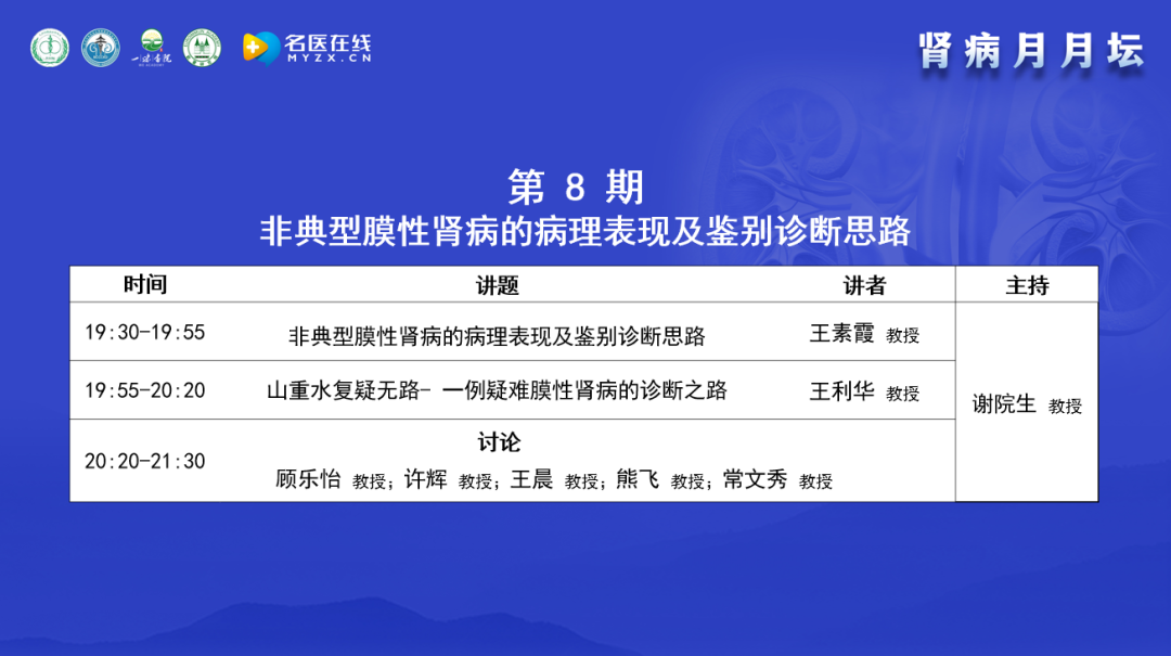 眾所周知,腎臟病患病率很高,特別是膜性腎病,在很多單位的腎活檢比率中占據第一;膜性腎病的無創診斷和治療手段日新月異;而且膜性腎病的異質性很大,很多膜性腎病的病理表現幾乎一致,但是致病原因卻不一致,診療手段應對應病因?;诖吮尘埃澳I病月月壇”自今年5月17日以來開始舉辦,在每個月的第三周的周二晚上,每月一期,每期一個主題,已經舉辦了七期,包括“激素和免疫抑制劑在膜性腎病的合理應用”、“利妥昔單抗在膜性腎病的合理應用”、“原發性和繼發性膜性腎病的鑒別”及“中醫對膜性腎病的認識”、“膜性腎病的抗原分類及發病機制”、“膜性腎病的臨床表現、無創診斷和病理診斷”以及“膜性腎病的自發緩解和非免疫抑制治療”。今天是第8期,本期論壇的主題是“非典型膜性腎病的病理表現及鑒別診斷思路”。邀請的講者和點評、討論嘉賓都是業內非常著名的臨床專家、研究生導師、腎內科主任,具有豐富的臨床、教學和科研經驗,相信他們的分享一定會對大家的臨床診療有所幫助。