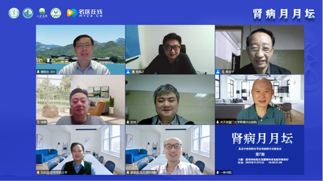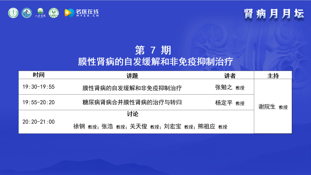疫情可能影響大家相聚,但卻阻止不了學(xué)術(shù)交流,“腎病月月壇”第七期如期而至。謝教授代表北京中西醫(yī)結(jié)合學(xué)會(huì)腎臟病專業(yè)委員會(huì)對(duì)各位專家、各位同仁及各位朋友出席本期“腎病月月壇”表示熱烈的歡迎和衷心的感謝。謝教授介紹,“腎病月月壇”簡(jiǎn)單五個(gè)字卻蘊(yùn)含著三層寓意:首先,“腎病”是指咱們論壇聚焦腎病和腎臟相關(guān)疾病的診斷、治療和預(yù)防,臨床、科研和教學(xué)。因?yàn)楝F(xiàn)在腎臟病很常見(jiàn),腎臟病的診療手段日升月異。比如膜性腎病,血中抗體的無(wú)創(chuàng)診斷,單克隆抗體的合理使用等,不學(xué)習(xí)就會(huì)落伍。其次,是“月月”,本論壇每個(gè)月舉辦一次,時(shí)間固定在每個(gè)月第三周的星期二晚上19:30-21:30,以便于參會(huì)者能夠提前安排好時(shí)間準(zhǔn)時(shí)參加線上直播,同時(shí),為了滿足時(shí)間確實(shí)沖突無(wú)法參加線上直播又迫切想學(xué)習(xí)的同行而提供了回放功能;最后是“壇”,“壇”也有三層意思,一是學(xué)術(shù)論壇,在這里只要是學(xué)術(shù)相關(guān)的內(nèi)容,什么都可以說(shuō)。二是談話、交談,大家可以在這里平等地交談。三是平臺(tái),學(xué)術(shù)交流的平臺(tái)、思想交流的平臺(tái),情感交流的平臺(tái),我們很多老朋友很久沒(méi)有見(jiàn)面了,通過(guò)腎病月月壇,可以每個(gè)月在云端見(jiàn)面一次。謝教授介紹道,“腎病月月壇”自今年5月17日開(kāi)壇以來(lái),每期一個(gè)主題,已經(jīng)舉辦了六期,包括“激素和免疫抑制劑在膜性腎病的合理應(yīng)用”、“利妥昔單抗在膜性腎病的合理應(yīng)用”、“原發(fā)性和繼發(fā)性膜性腎病的鑒別”及“中醫(yī)對(duì)膜性腎病的認(rèn)識(shí)”、“膜性腎病的抗原分類及發(fā)病機(jī)制”以及“膜性腎病的臨床表現(xiàn)、無(wú)創(chuàng)診斷和病理診斷”。本期論壇的主題是“膜性腎病的自發(fā)緩解和非免疫抑制治療”。邀請(qǐng)的講者和點(diǎn)評(píng)、討論嘉賓都是業(yè)內(nèi)非常著名的臨床專家、研究生導(dǎo)師、業(yè)務(wù)院長(zhǎng)、大內(nèi)科主任、腎內(nèi)科主任,具有豐富的臨床、教學(xué)和科研經(jīng)驗(yàn),相信他們的分享一定會(huì)對(duì)大家的臨床診療有所幫助。