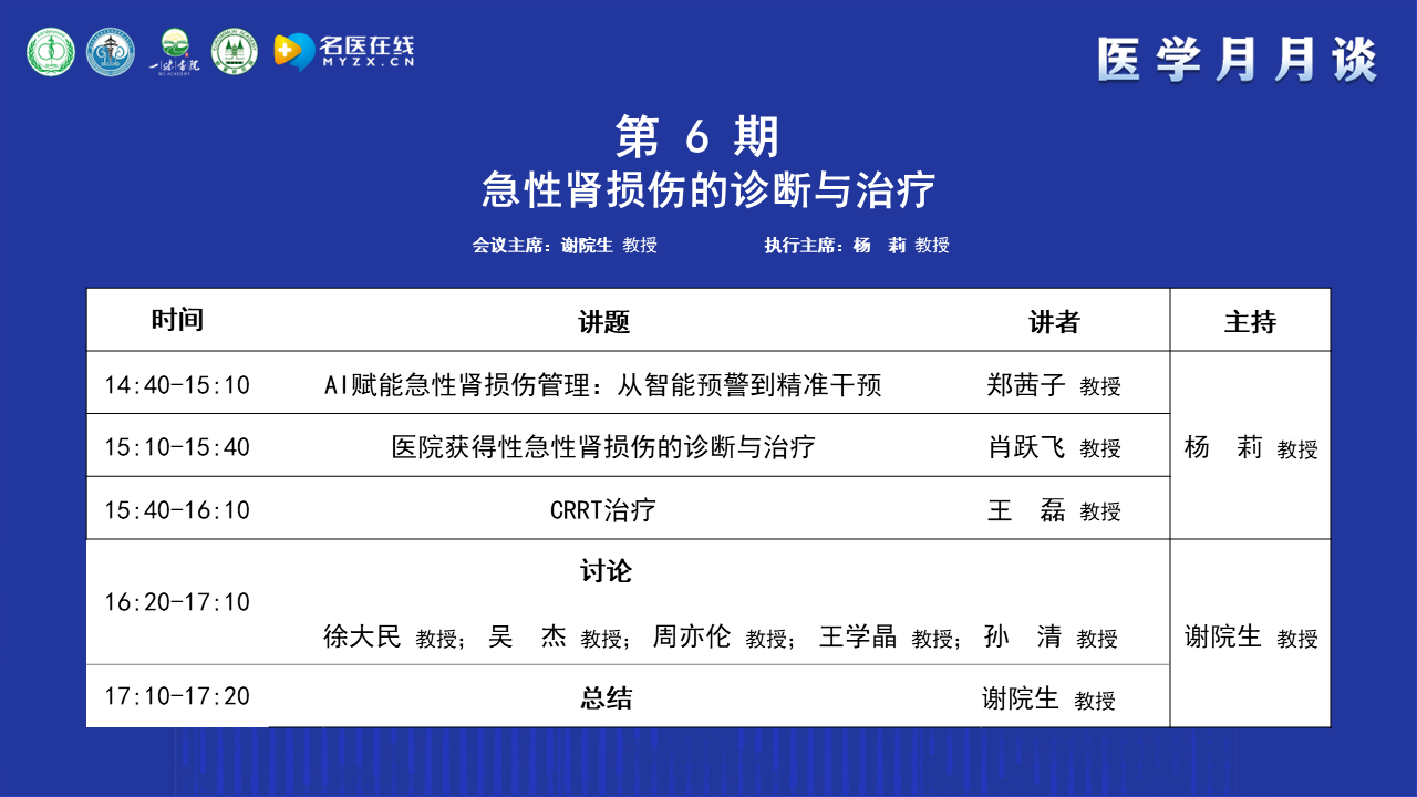 謝教授簡單介紹了“醫(yī)學(xué)月月談”的前身“腎病月月壇”的歷史,“腎病月月壇”是在疫情防控期間開展的線上學(xué)術(shù)交流活動,以腎臟病或系統(tǒng)性疾病腎損害的診治為主,每期一個主題,形式和內(nèi)容都很受歡迎。為了讓更多的人受益,升級為“醫(yī)學(xué)月月談”。“醫(yī)學(xué)月月談”是一個以臨床需求為導(dǎo)向,以解決臨床問題為目的,線下和線上相結(jié)合的醫(yī)學(xué)交流活動。本期醫(yī)學(xué)月月談的主題是急性腎損傷,非常榮幸的邀請到在急性腎損傷研究領(lǐng)域非常著名的楊莉教授作為本期的執(zhí)行主席,相信本期月月談將在楊教授的引導(dǎo)下,在各位專家們的大力支持下,取得圓滿成功。