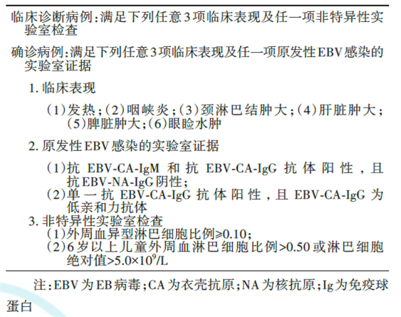 IM的診斷依據(jù)包括臨床表現(xiàn)、原發(fā)性EBV感染的實(shí)驗(yàn)室證據(jù)和非特異性實(shí)驗(yàn)室檢查(表1)。臨床診斷病例需滿足臨床表現(xiàn)中任意3項(xiàng)及非特異性實(shí)驗(yàn)室檢查中任意1項(xiàng),確診病例需滿足臨床表現(xiàn)中任意3項(xiàng)及原發(fā)性EBV感染的實(shí)驗(yàn)室證據(jù)中任意1項(xiàng)。
