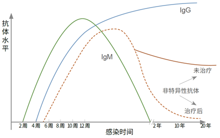 梅毒感染的診斷需綜合流行病學史、臨床表現和實驗室檢查等。梅毒IgM最早出現,抗體水平與疾病活動度及治療效果相關。梅毒IgG 4周左右出現,不易消退,可持續終生。